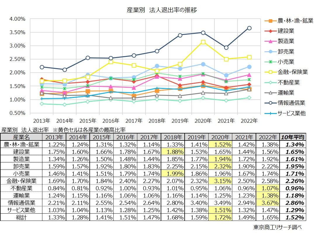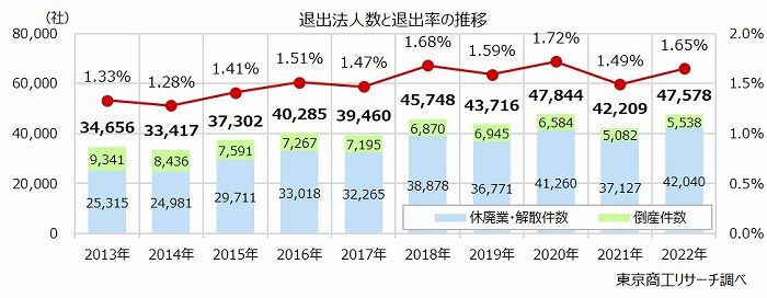 実質無利子・無担保融資(ゼロゼロ融資)の返済の本格化や物価高、人手不足によるコストアップなどで倒産が増加しているが、同時に、代表者の高齢化などによる休廃業・解散も増え、退出率を押し上げた。
